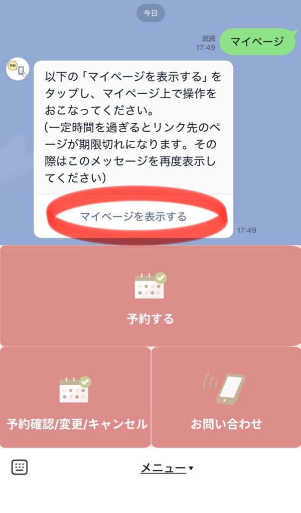 予約確認・変更・キャンセル お知らせ 2026.02.04 LINEの左下「予約確認/変更/キャンセル」をタップします。 「マイページを表示する」をタップします。 現在、お取りいただいている予約が全部表示されます。